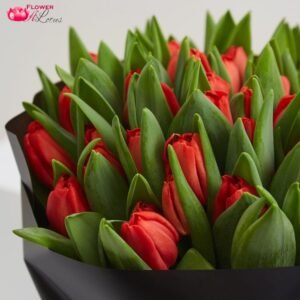 This beautiful 30 red tulips Simple bouquet. The flowers are usually large, showy and brightly colored, generally red, pink, yellow, or white (usually in warm colors).