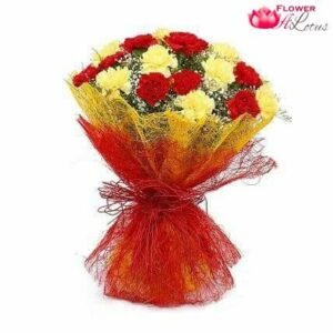 Send this glorious flower bouquet that includes beautiful fresh 16 Red N Yellow Carnations and decorated with White Feelers.