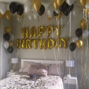 - 100 black silver and golden balloons on the ceiling with ribbon and around the room