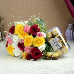 Be it any occasion, you can now surprise and enchant your loved ones in India with this delightful and heavenly combo. This hamper consists of a colorful bouquet of mixed roses for you to surprise your friends and family with. Whatever you want to express, this gift will speak up for you. Along with the rose bouquet, your dear one also gets a box of delicious Ferrero Rocher.