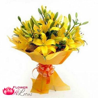 Gift a vibrant 6 stems of Yellow Lilies arranged in Yellow tissue wrapping and tied with a matching ribbon. It may be the perfect gift for all the special people you wish to delight on their very special day.