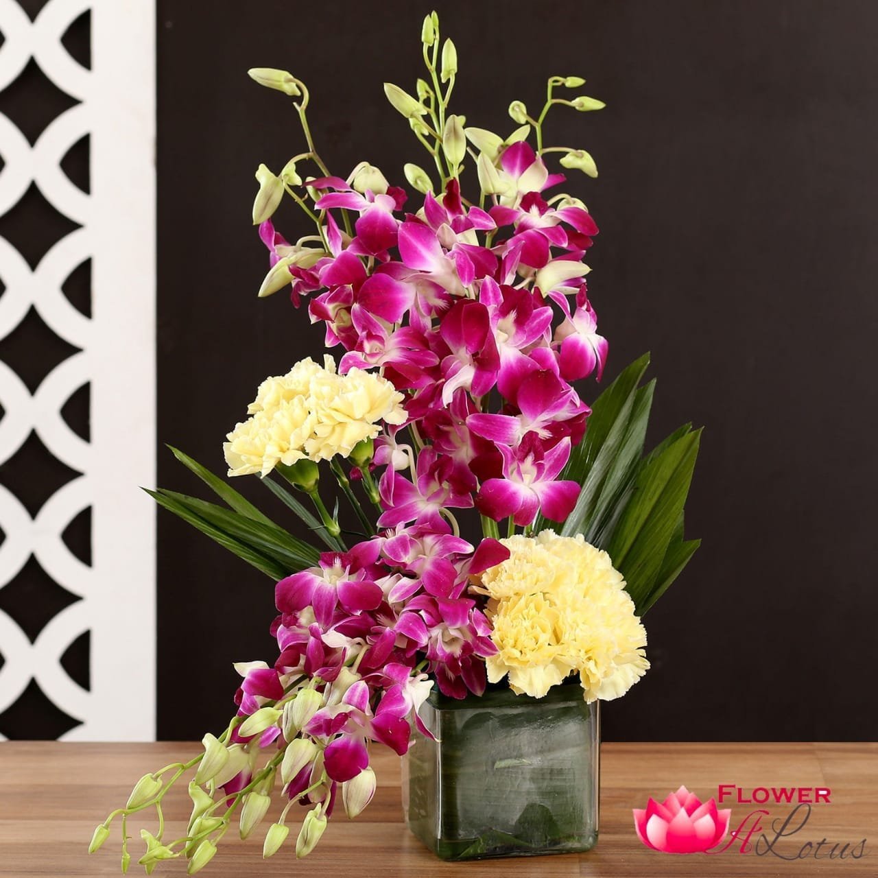 Send a beautiful fresh flowers arrange with green leaves in a glass vase of 14 Stem Purple Orchids & carnations to your friends and family on any special day.flowers in gurgaon