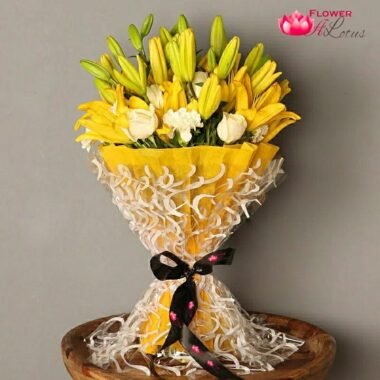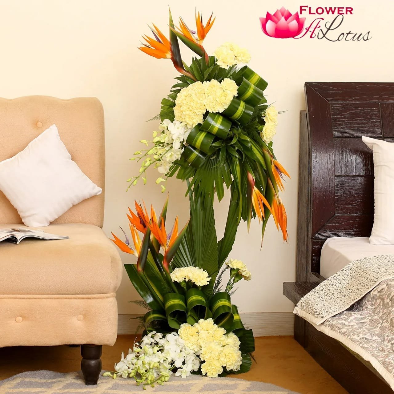 This basket fiilled with 8 Birds of Paradise ,32 Yellow Carnations,10 White Orchids ,Green Fillers ,Arranged on a Wooded Drift, Arrangement Height- 2 to 3 Feet will be an ideal gift for your loved ones in India on any occasion. It goes without saying that flowers can brighten anyone’s day. Thus, send this beautiful bouquet to your dear ones in Floweralotus.in and bring a smile on their faces. Along with this exotic bunch, you can also send other Gifts to India.