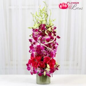 Why not celebrate this coming occasion by presenting this marvelous orchid bouquet to your loved ones ? Arranged in an unique way this arrangement of 6 stems Purple Orchids and 12 Pink Roses in a arrange in a glass vase is one need to have a good start to their day.Send this gift through Best online florist in Gurgaon “Autumn Lotus”.