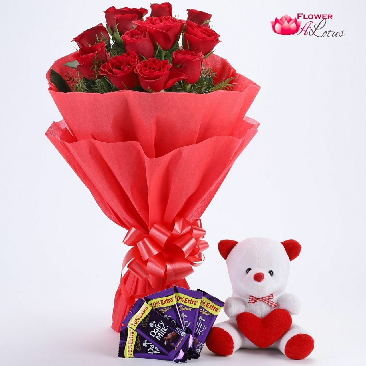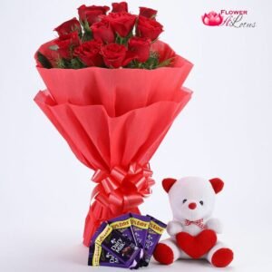 We have just the right Gift Hamper for you that is sure to make you everyone’s favourite. Send this Gift Hamper that has a bunch of 12 Red Roses, wrapped in Red Paper Packing,red bow, sweet 5 Cadbury’s DairyMilk Chocolates and a soft little Teddy Bear.