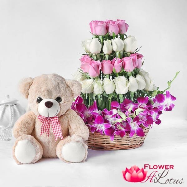 15 Pink Roses, 15 White Roses and 5 stem of Purple Orchids are arranged in an adorable basket and decorated by fillers, green leaves With a 10 Inch Teddy