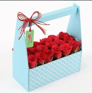 Send this flower basket of 18 Red Roses, Cream Colour Wooden Handle Base, Red Raffia to your loved ones.