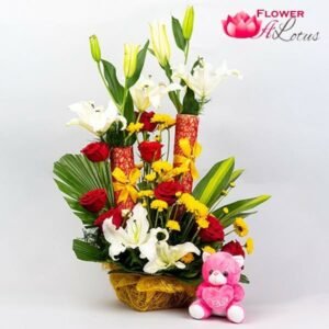 The splendid combination of flowers and teddy has a magical effect on the recipient at any given time. Comprising 3 white Star Gazer Lilies, 8 red roses and yellow desigs , the divine flower bouquet simply makes the day of your loved one.Be it an occassion or any other normal day, send this mixed flower bouquet and teddy combo to your loved one and see his/her eyes light up with unparalled joy.