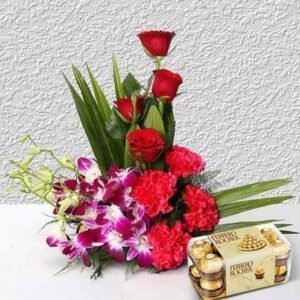 Arranged in an unique way this arrangement of 4 Purple Orchids,4 Dark Pink Carnations,4 Red Roses in Basket with green Leaves is one need to have a good start to their day.Celebrate this coming occasion by presenting this inspire emotions by orchid,Roses and carnations basket and Ferrero Rocher chocolates to your loved ones .
