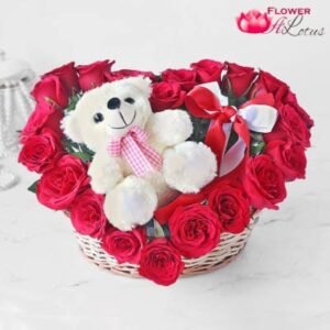 The Truly Yours Rose arrangement is a bright and beautiful way to send your love and affection across the miles!! A gorgeous heart shape arrangement to create an incredible presentation to sweep your sweetheart off their feet. The lovely heart shape arrangement is a wonderful gift that any of the loves in your love will adore. Heart shape arrangement of 21 Red Roses and 6 inch cute soft toy with Lot of green fillers.