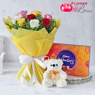 Gift An exclusive hamper of cadbury Celebration dairy milk chocolates with red rose and 6 inch teddy.