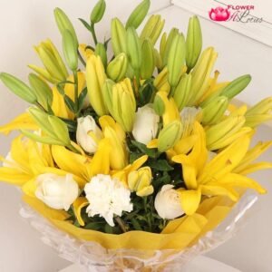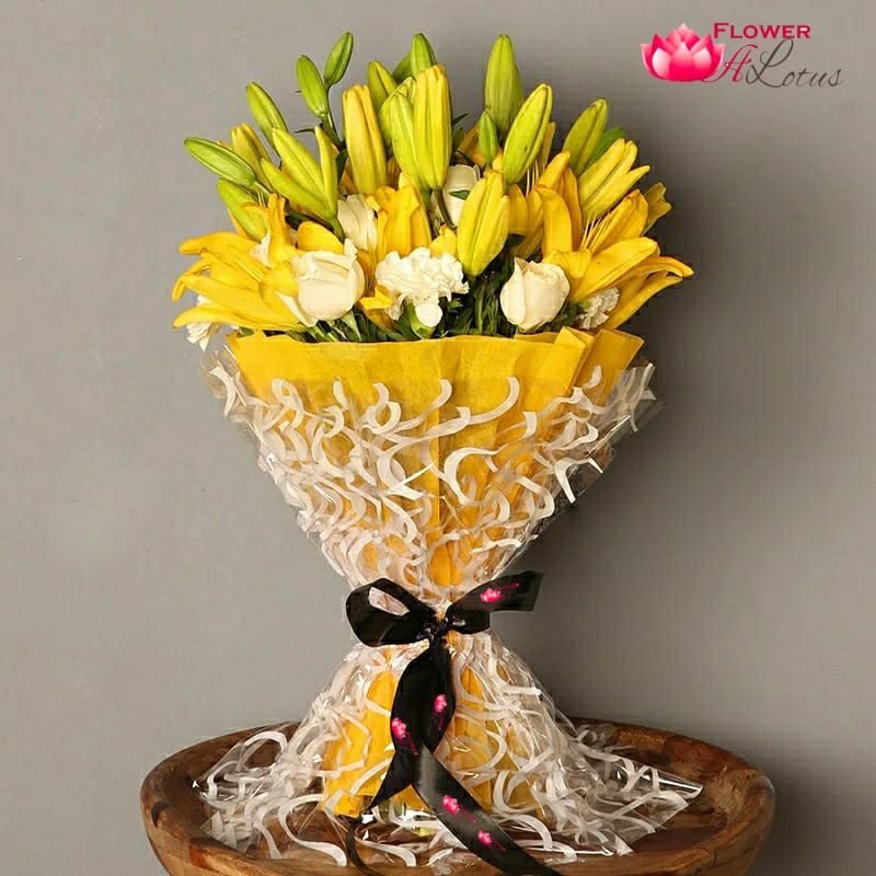 White Roses, White Carnations, and yellow Lilies is the perfect floral combination you need to surprise your dear ones on any occasion. Express your heartfelt wishes with this handcrafted unique bouquet of charming flowers. Order it straight away!