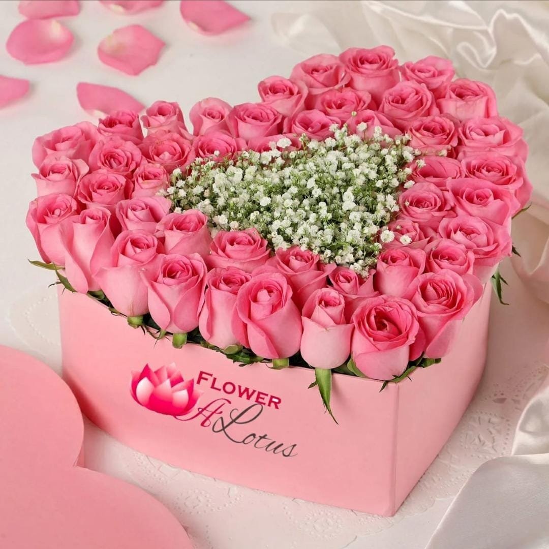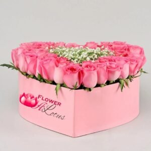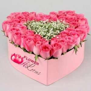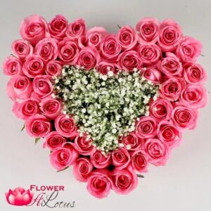 Send this hear shape flower basket of 45 pink Roses,hear shape Base, Baby’s breath filling in center to your loved ones.