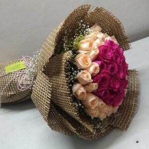 Looking for surprise gift on special day . This Premium Luxury flower Bouquet is the perfect gift to wish loved one on Birthday ,Anniversary . This flower bouquet fill with 20 Pink Roses, 30 Peach Roses, Brown Jute Packing,Use Seasonal feelers to make luxury Hand Bouquet .