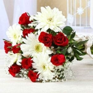 - An Assortment of 12 Red Roses and 6 White Gerberas.