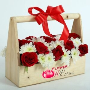 Send this flower basket of 12 Red Roses, 5 White Daisies, Cream Colour Wooden Handle Base, Red Ribbon to your loved ones.