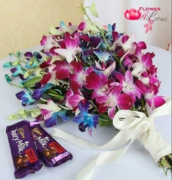 20 Pink Roses and 6 stem of Purple Orchids are arranged in an adorable basket and decorated with fillers and green leaves. Egg less chocolate Cake 500 gm.
