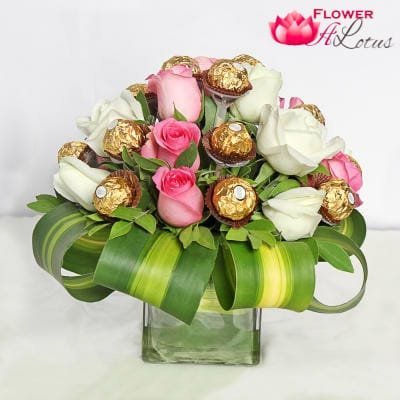Ferrero rocher chocolates are favourite of everyone. Floweralotus combines these delectable chocolates with 6 pink roses and 6 white roses in a square glass vase, which is a superb presentation for anyone you love.