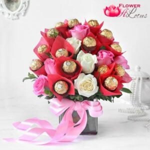 Ferrero rocher chocolates are favourite of everyone. Floweralotus combines these delectable chocolates with 8 pink roses and 8 white roses in a square glass vase, which is a superb presentation for anyone you love.