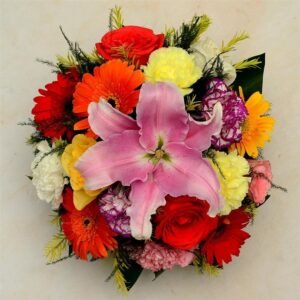 - 1 Yellow Gerbera, 2 Red Gerbera, 2 Orange Gerbera, 2 Yellow Carnation, 2 White Carnation, 1 Pink Carnation, 1 Pink Lily, 1 Yellow Rose, 1 Red Rose, 1 White Rose, 1 Pink Rose. Decoration Has Been Done With Asparagus, Desina and Victoria