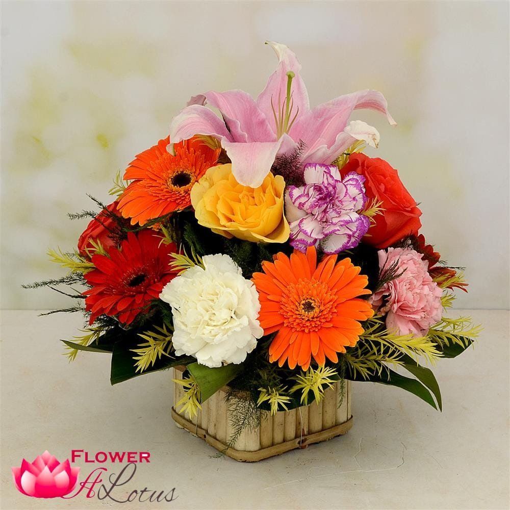Beautiful Small Basket Comes With 1 Yellow Gerbera, 2 Red Gerbera, 2 Orange Gerbera, 2 Yellow Carnation, 2 White Carnation, 1 Pink Carnation, 1 Pink Lily, 1 Yellow Rose, 1 Red Rose, 1 White Rose, 1 Pink Rose. Decoration Has Been Done With Asparagus, Desina and Victoria