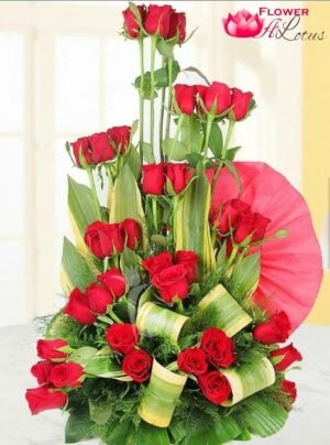 This is an arrangement of 40 Red roses. It depicts surreal beauty and shall light up the spirits of the beholder. This tall arrangement is a perfect gift for anniversary, birthday or just to impress someone with beautiful red roses standing tall in front of them.