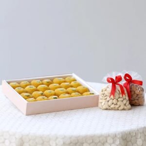 1 kg Motichoor laddoo and 250 gm Dry fruits (Mithai image shown is only for reference purposes but products may be the same or vary in shape and design as per the availability)