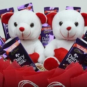 Show your love and send gift through Autumn Lotus to your family and close friends with this appealing basket arrangement. It includes a pair of red and white coloured teddy bear and 10 pieces of cadbury dairy milk chocolates.