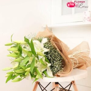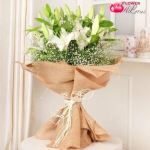 This is a bunch of 7 stems of white Lilies, featuring bright color and magnificent fragrance. The bunch raffia not with Jute Packing, it looks fantastic as a present, gracing all occasions.