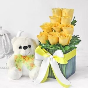Surprise to near dear ones send this gifts with yellow roses arrange with green leaves in glass vase with soft toy teddy through “Autumn Lotus”.