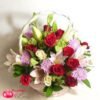 Send the arrangement of 3 stem White Lilies(3*3=9 flowers) and 12 Red Roses with 6 Pink Carnations to India and enthrall your dear ones. This arrangement comes in a round basket with a handle.